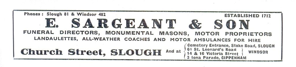 Sargeant’s name can be associated with Windsor since the early part of the twentieth century when it is believed that an existing funeral business in St Leonard’s Road was acquired. What is known for certain is that by the interwar years the firm had expanded by opening a network of branches. Whilst the head office remained at Church Street in Slough, the 1935 edition of Kelly’s Post Office Directory lists the following locations: by the cemetery entrance on Stoke Road in Slough; at 61 St Leonard’s Road and 14 & 16 Victoria Street in Windsor and also at Iona Parade in Cippenham. Although these branches remained open for a number of years, by the 1980s only Church Street and St Leonard’s Road existed. Over the years both sites have been developed, including the provision of purpose-built chapels of rest at Windsor. The business remained in the family until the death of Edward ‘Teddy’ Sargeant in 1988. His secretary, Pat O’Neill, then took over before selling it to Funeral Partners Ltd shortly before her death in 2009.