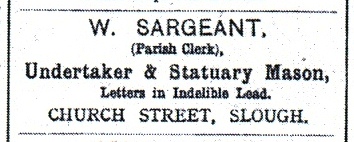 William Sargeant (d. 1896) lived in a thatched house near Slough Parish Church where he carried on a building and funeral business. In 1854 he was appointed parish clerk and was known to be an industrious worker. For example, when the parish church acquired an organ to replace the two clarinets and bassoon that were used to accompany hymns, William Sargeant formed a choir.